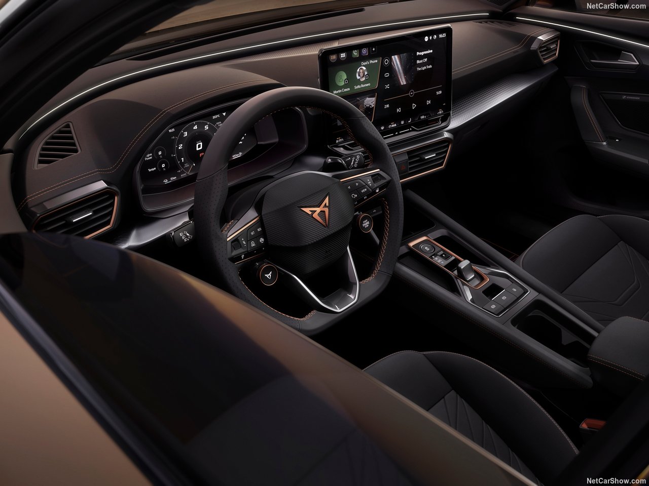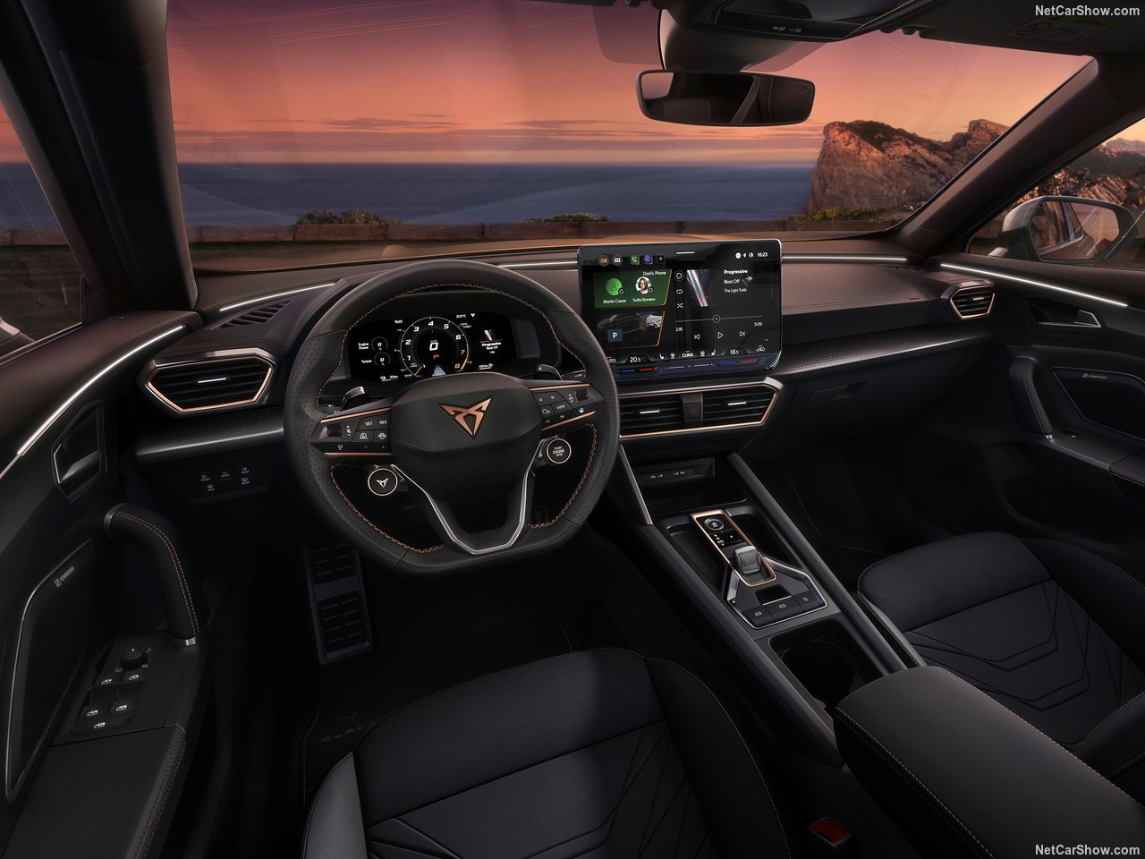 Gli interni del Formentor offrono un abitacolo lussuoso e orientato al conducente, con materiali di alta qualità e finiture sofisticate. I sedili sportivi in pelle, riscaldati e regolabili elettricamente, assicurano un comfort superiore e un supporto ottimale durante la guida. Il sistema di infotainment include un display touchscreen da 12 pollici che integra navigazione, intrattenimento e connettività smartphone tramite Apple CarPlay e Android Auto, mentre il climatizzatore automatico a due zone garantisce un ambiente piacevole per tutti i passeggeri.
